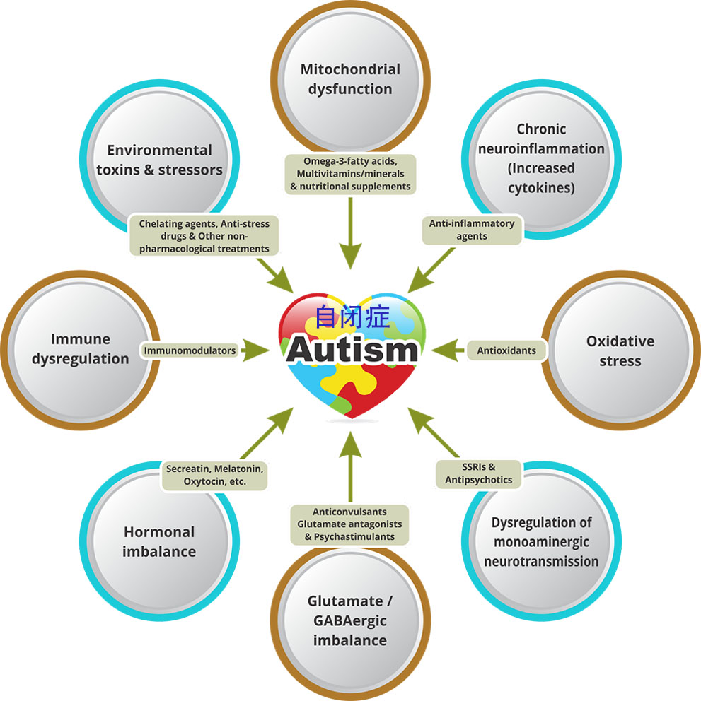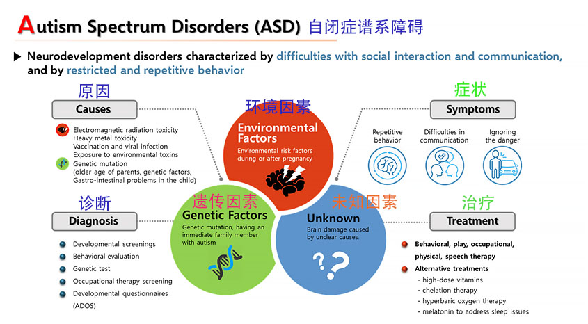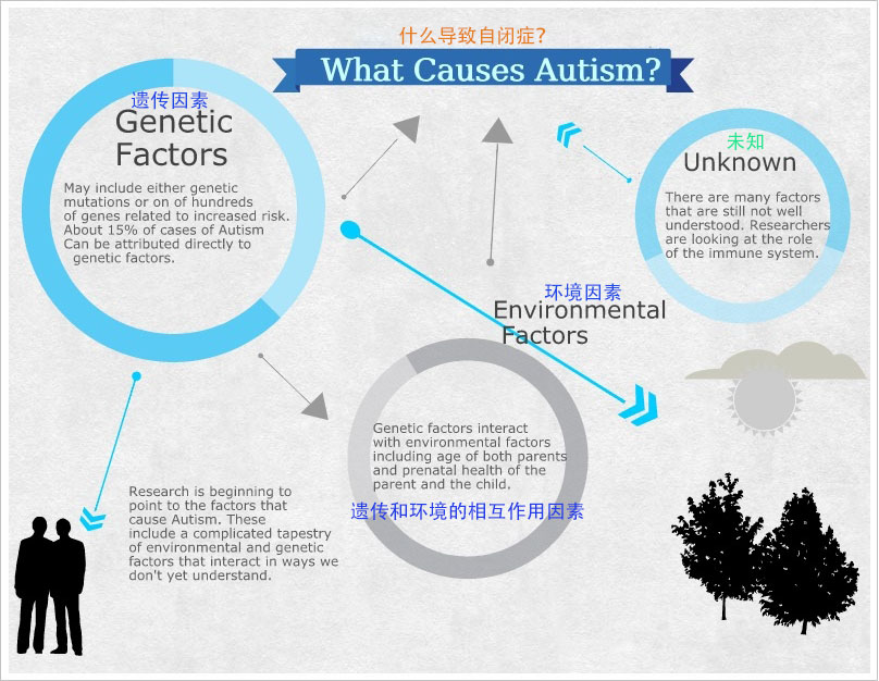 • 自闭症的成因更为复杂,涉及数百个易感基因,以及孕妇在孕期接触致畸因素和其他环境因素。