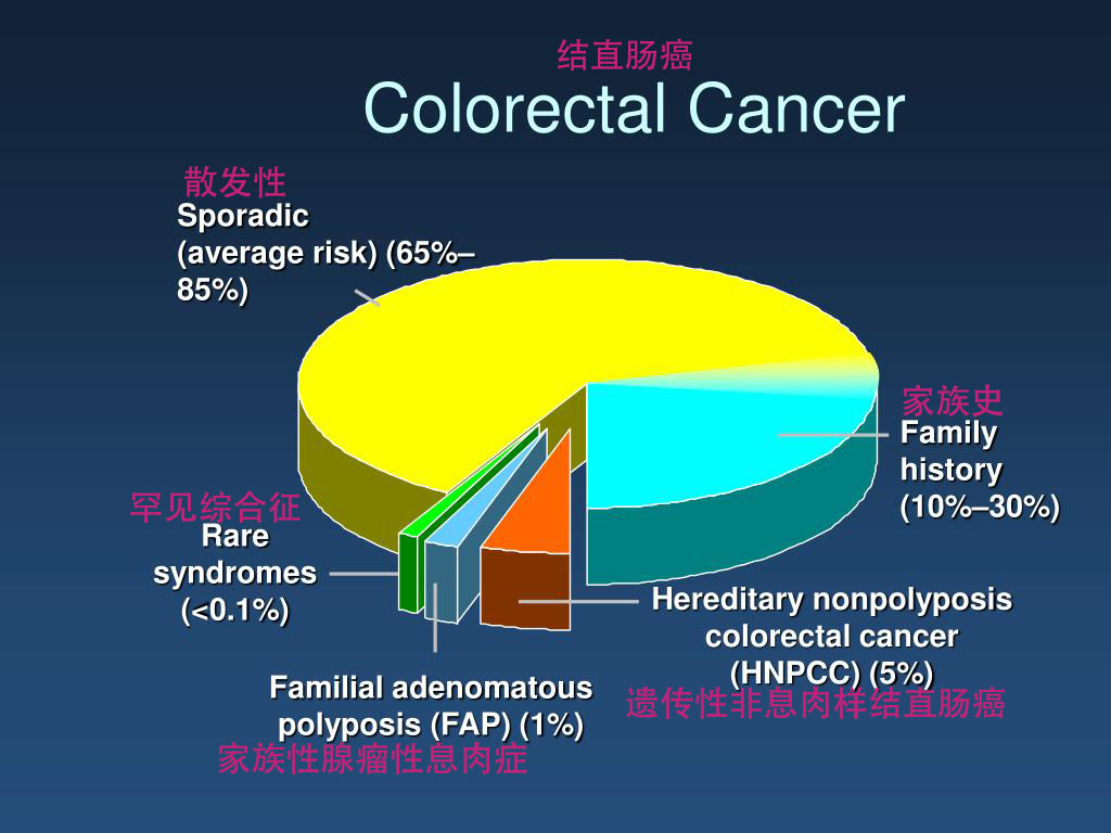 2.遗传性非息肉性结直肠癌(Hereditary non-polyposis colorectal cancer,HNPCC)约占5%的病例,由于DNA错配修复基因mutations导致,呈现明确的遗传倾向。