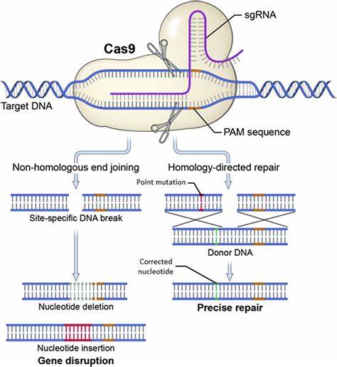CRISPR-Cas9调控机制:通过内源性的非同源末端连接(NHEJ)或同源定向修复(HDR)修复双链DNA断裂