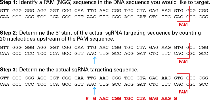DNA目标序列的3’端必须具有原间隔相邻序列(PAM)序列(5’-NGG-3’)。PAM序列上游的20个核苷酸将成为您的目标序列(crRNA),Cas9核酸酶将在PAM上游约三个碱基处切割。